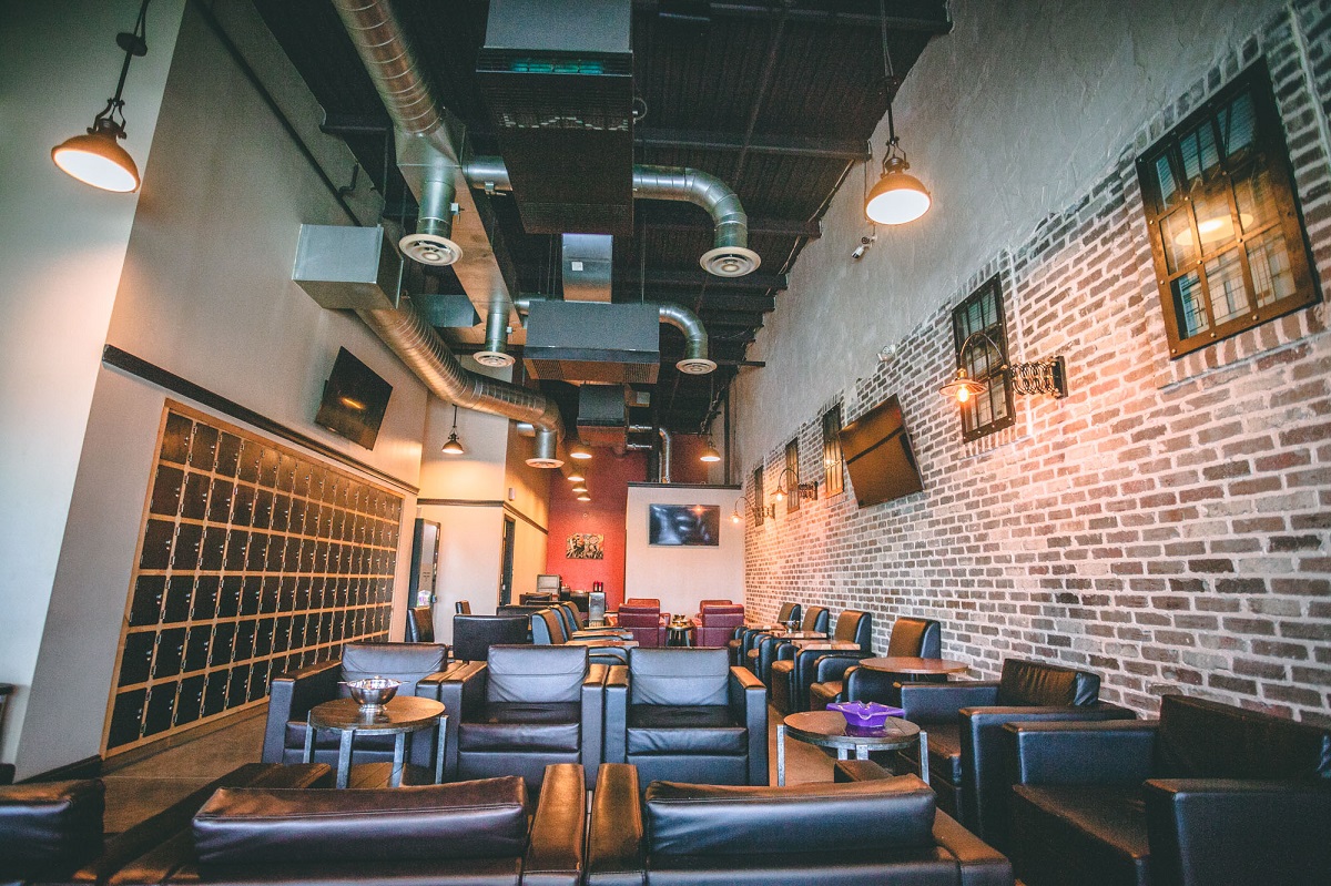 Access to the public lounge is free, or monthly memberships are available and include a locker. Private members have access to a private lounge with lockers and access to “The Stash” liquor cabinet. A humidor vault features a wide selection of cigars for purchase.