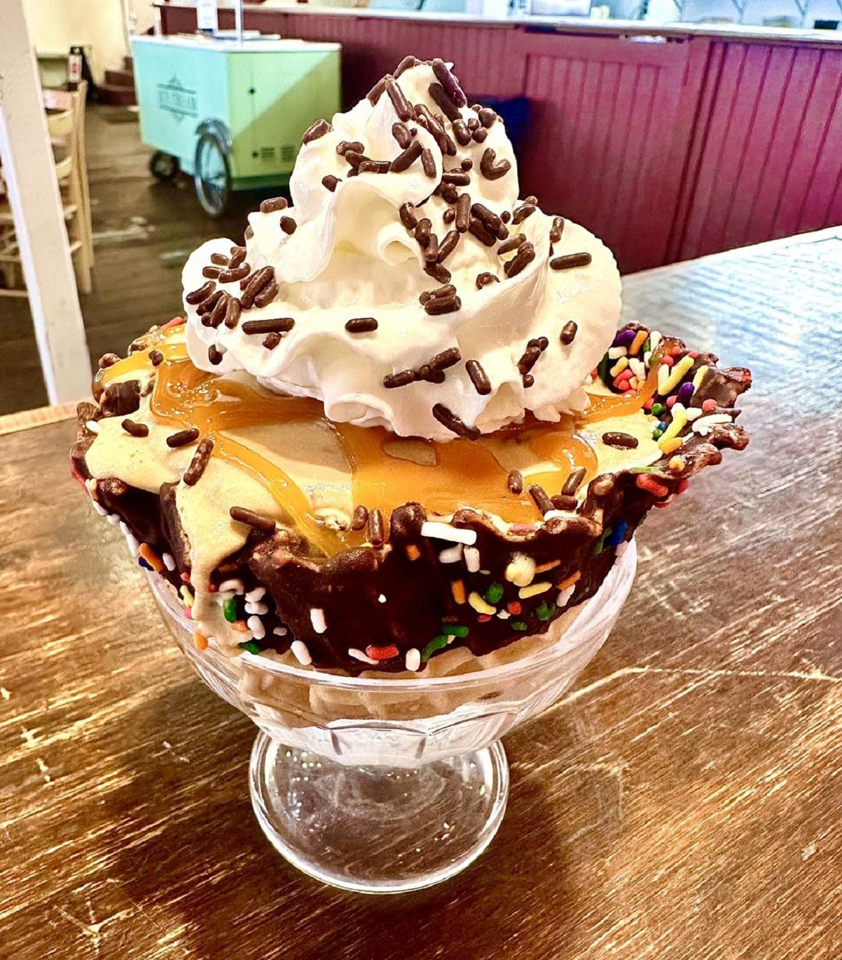 The shop has about 100 flavors of artisanal ice cream and dairy-free sorbets. Each ice cream is made “from the richest 18% butterfat ice cream base,” and pure Madagascar Bourbon Vanilla is used to develop the flavor. Some Specialty ice cream flavors include Maple Bourbon Baconater, Futterbinger, and Jack-N-Coke. Although the menu features homemade ice cream infused with high-quality liqueurs and fruit wines, non-alcoholic options are available including chocolate, strawberry, and vanilla ice cream.