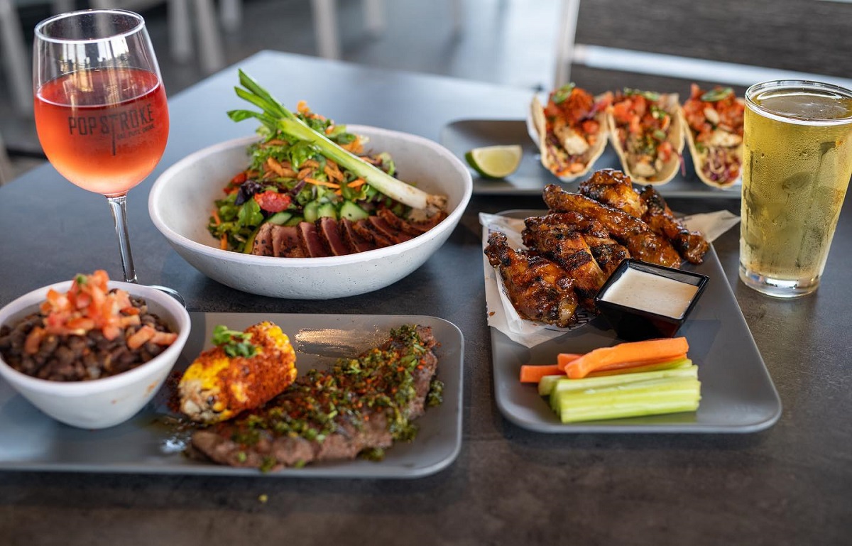 The PopStroke menu features small bites of wings, meatballs, and pretzels. Guests can also enjoy a variety of pizzas and salads. Craft beer, wine, and cocktails will also be available.