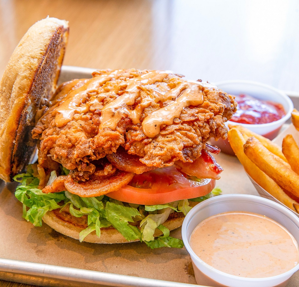 You can pick your protein—breaded chicken, grilled chicken, or fried cauliflower—for a variety of sandwiches including the Soul Bird with house-cut pickles on a toasted brioche bun. The Shack features your choice of protein with a fried egg, applewood smoked bacon, crisp greens, and tomato on a toasted brioche bun.