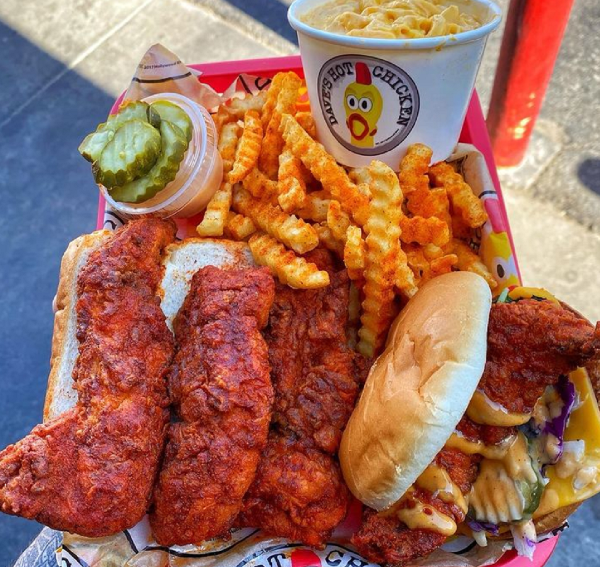 According to the Dave’s Hot Chicken website, friends Dave Kopushyan, Arman Oganesyan, Tommy Rubenyan, and Gary Rubenyan first began selling their chicken out of a stand in an East Hollywood parking lot. The concept took off, and now franchising opportunities are available across the country.