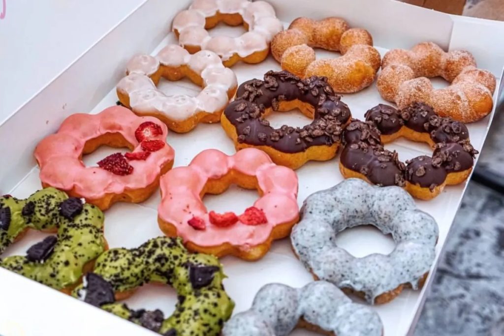 The chain is known for their many donut options, as well as mochinut-balls with flavors like creme brulee and cookies & creme. Along with their signature donuts, Mochinut also sells fried hot dogs with mozzarella, potatoes, crispy ramen, and hot cheetos. Soft serve ice cream and drinks are offered at some locations.