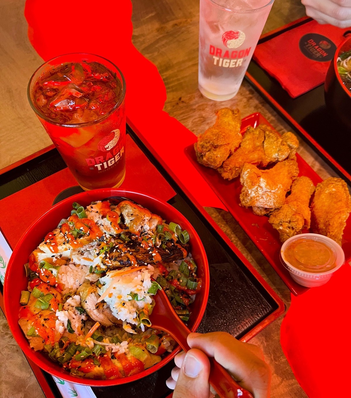 The Dragon Tiger Noodle Company menu takes a build-your-own approach, allowing guests to assemble their own noodle concoctions. There are also pre-imagined options. Chef Jet’s Dragon Noodle Bowls come in varieties like Tonkotsu Ramen, Hokkaido Beef, and Chinese Chicken Noodle Soup. Tiger Rice Bowls include Beef Pho Infused Rice and Thai Yum Infused Rice. Chef Jet’s Dragon Wings are another popular choice.