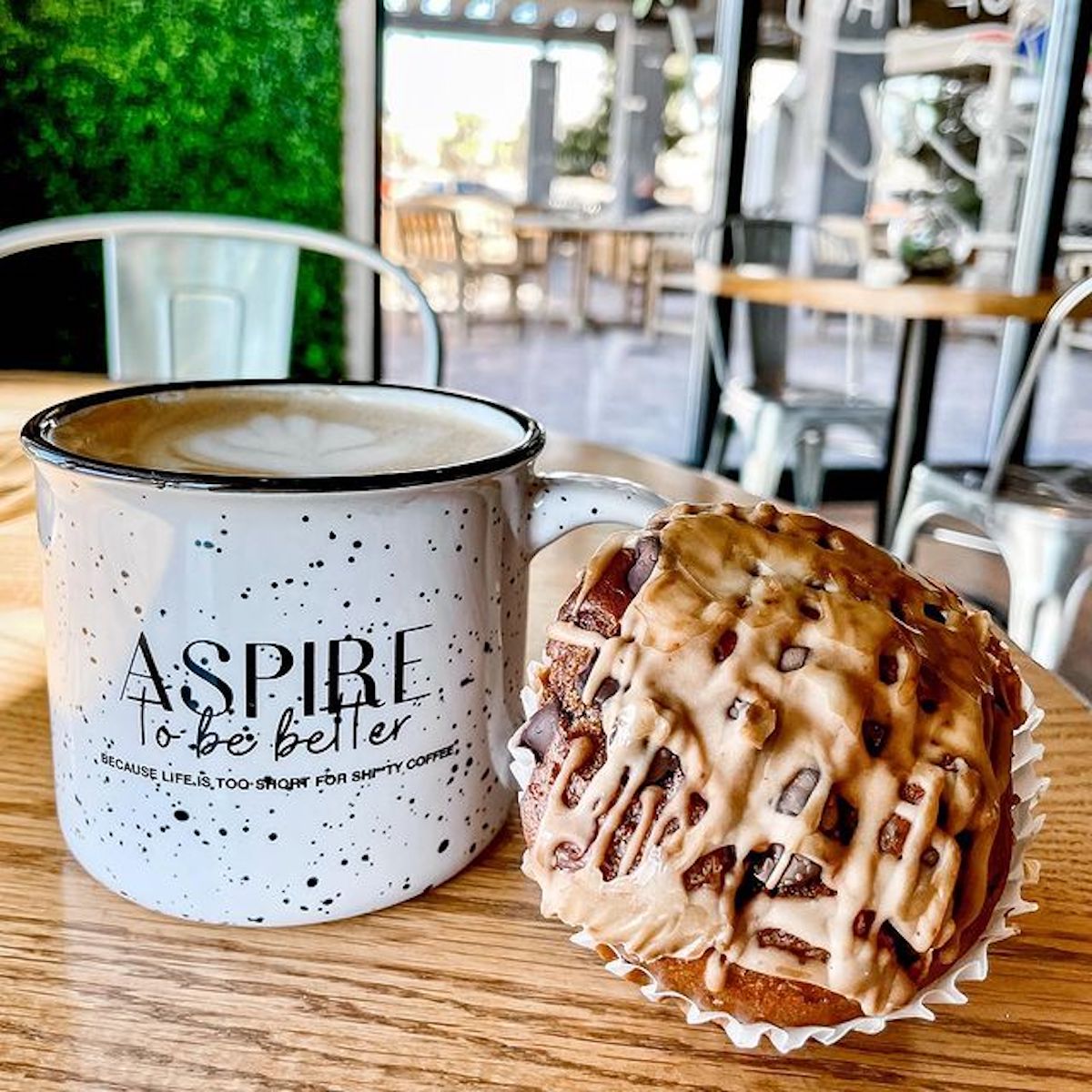 Aspire currently offers a variety of coffee and tea drinks, including cold brews, “Superfood Lattes” like the Green Eye (matcha with a shot of organic espresso), and an assortment of chai lattes.
