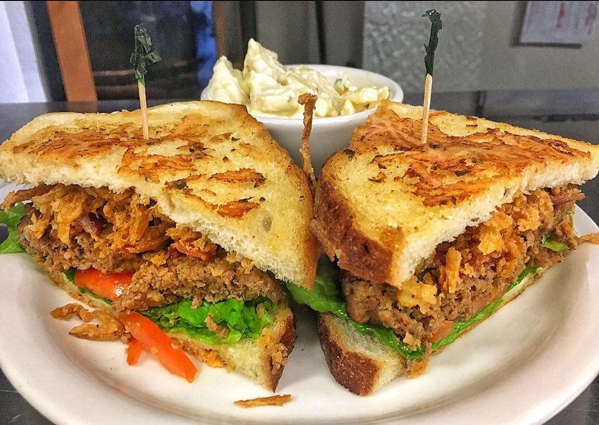 Breakfast is also served 24 hours a day, and each breakfast entrée comes with a complimentary glass of champagne or mimosa. These include the Hangover Skillet (Potatoes O’Brien topped with chicken fried steak, country gravy, biscuits, mixed cheese, two eggs cooked to order) and Huevos Rancheros.
