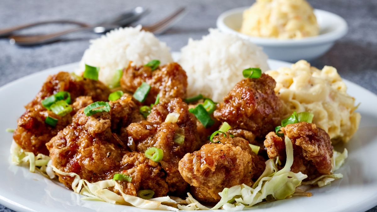 Favorites from the menu include the Char Siu Pork Plate (pork marinated in char siu sauce), Char Siu Pork Pac (Hoki, fried wun tun, Portuguese sausage, and pork marinated in char siu sauce), and Teriyaki chicken.