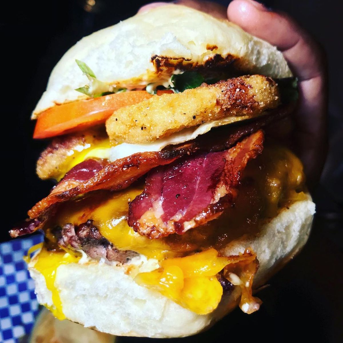 In food truck form, Kraken Cafe has offered breakfast choices including Chicken and Waffle (or Chicken and French Toast!) and breakfast sandwiches with egg and cheese, plus bacon or sausage. The menu’s selection of burgers includes the Umami Burger (lettuce, tomato, cheese, dijonaise, fried egg, pork sauce, skirt steak, short ribs, and a burger patty) and the Bison Burger (lettuce, tomato, cheese, fried egg, Port sauce, bacon, dijonaise, fried calamari rings and a bison patty).