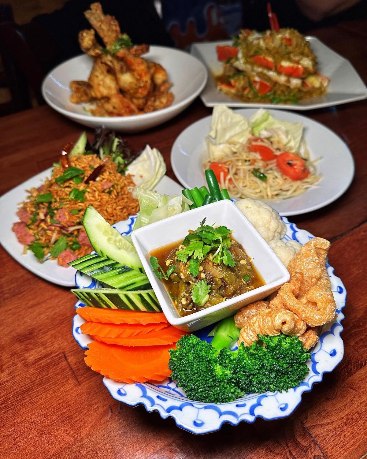 The menu has also featured BBQ dishes including Pla Dook Yang (Charbroiled whole catfish, served with tangy, spicy sauce & tamarind sauce) and Charbroiled Prawns, followed by a selection of specials, including Nua Nam Tok (Sliced charbroiled beef mixed with green onions, red onions, cilantro, dried & fresh chilies, lime juice & rice powder) and Hoh Mok Kai (with curry paste-chicken, egg. sliced cabbage cooked in a bowl).