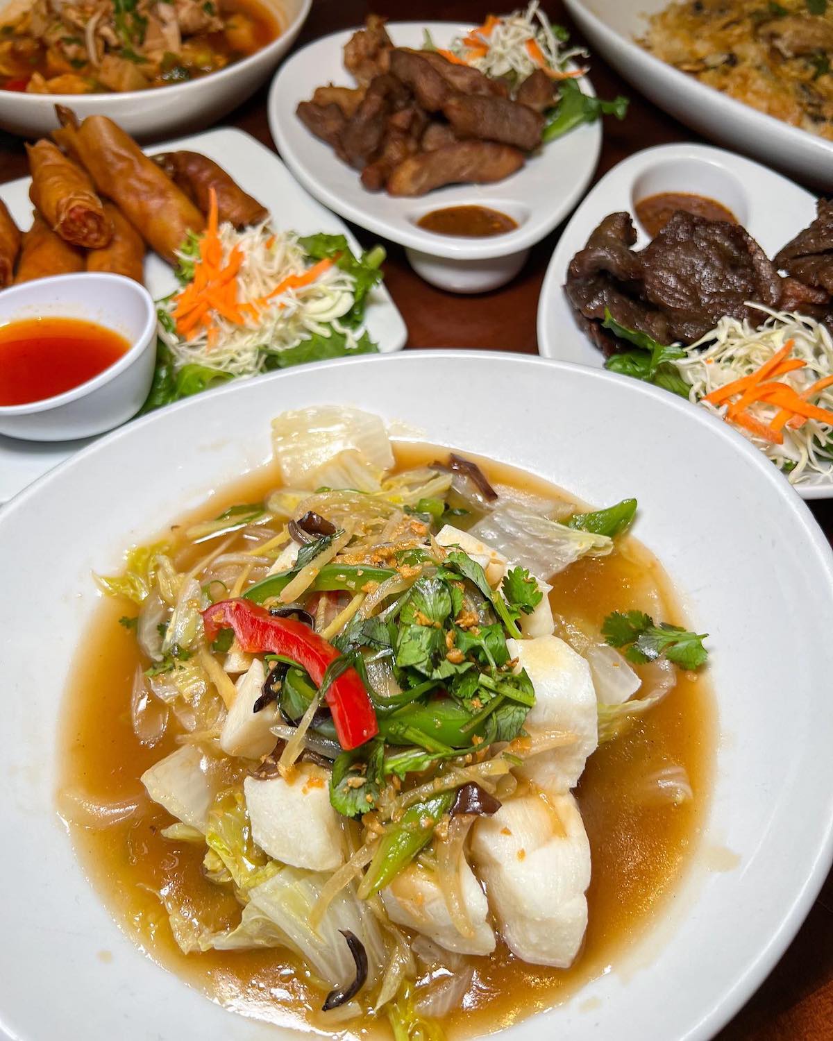 The menu has also featured BBQ dishes including Pla Dook Yang (Charbroiled whole catfish, served with tangy, spicy sauce & tamarind sauce), along with specials like Nua Nam Tok (Sliced charbroiled beef mixed with green onions, red onions, cilantro, dried & fresh chilies, lime juice & rice powder) and Hoh Mok Kai (with curry paste-chicken, egg. sliced cabbage cooked in a bowl).