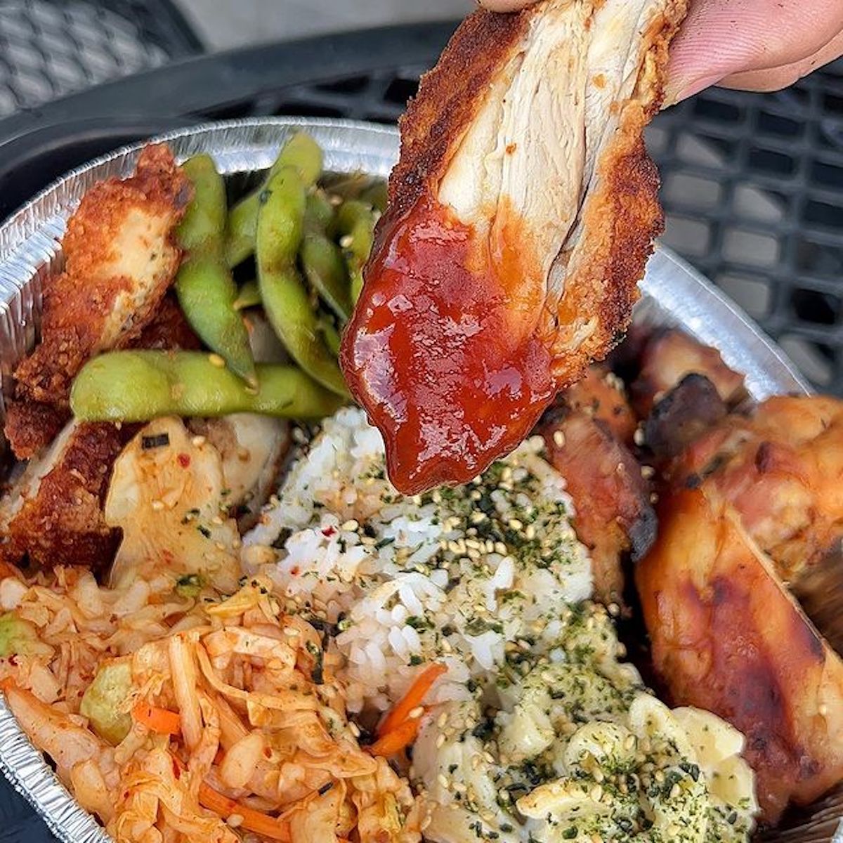 The chain’s menu applies the now-familiar choose-your-own process in which guests choose a size (Ono, Ono’er, and Ono’est, offering one, two, or three meat choices) and go: choose white or brown rice and your protein(s), with choices including Teriyaki Chicken, Kalua Pig, Chicken Katsu, Poke (Ahi Tuna), and more.