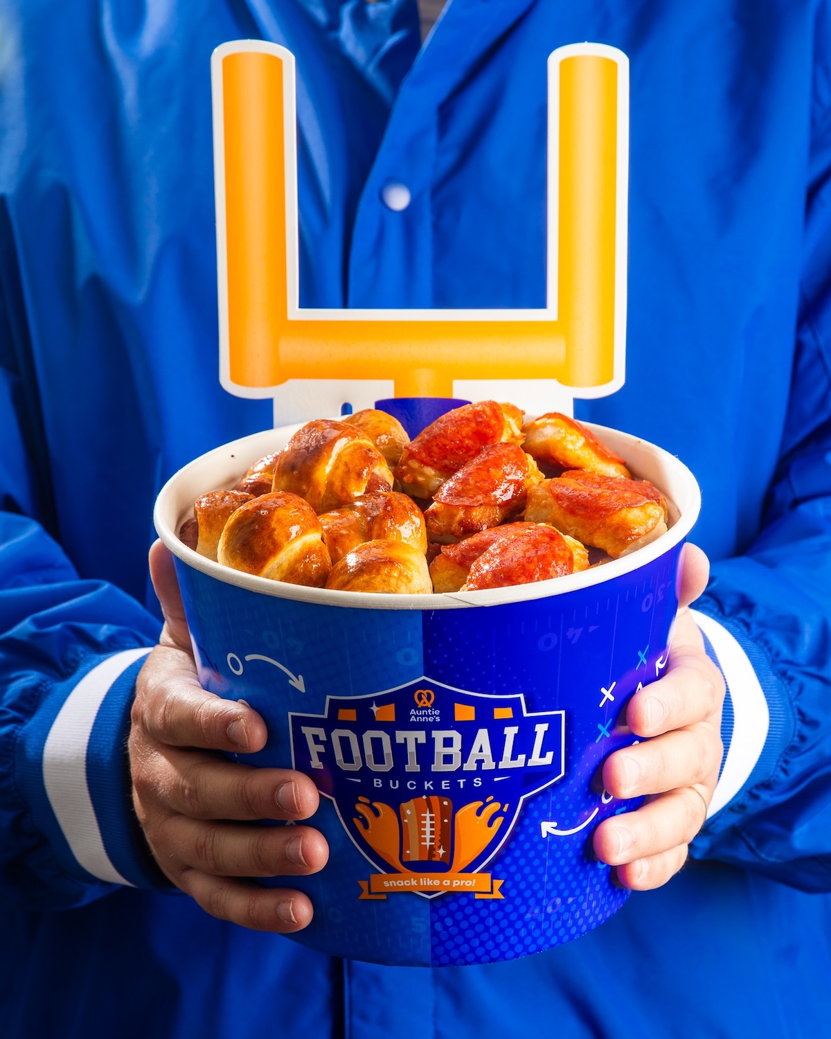 Currently featured items from the Auntie Anne’s menu include Football Buckets with two flavors of the brand’s Pretzel Nuggets/Mini Dogs, plus a choice of three dips. There’s plenty on the beverage front, too, like the Watermelon Spritz and Watermelon Frozen Lemonade Mixer (which also comes unfrozen).