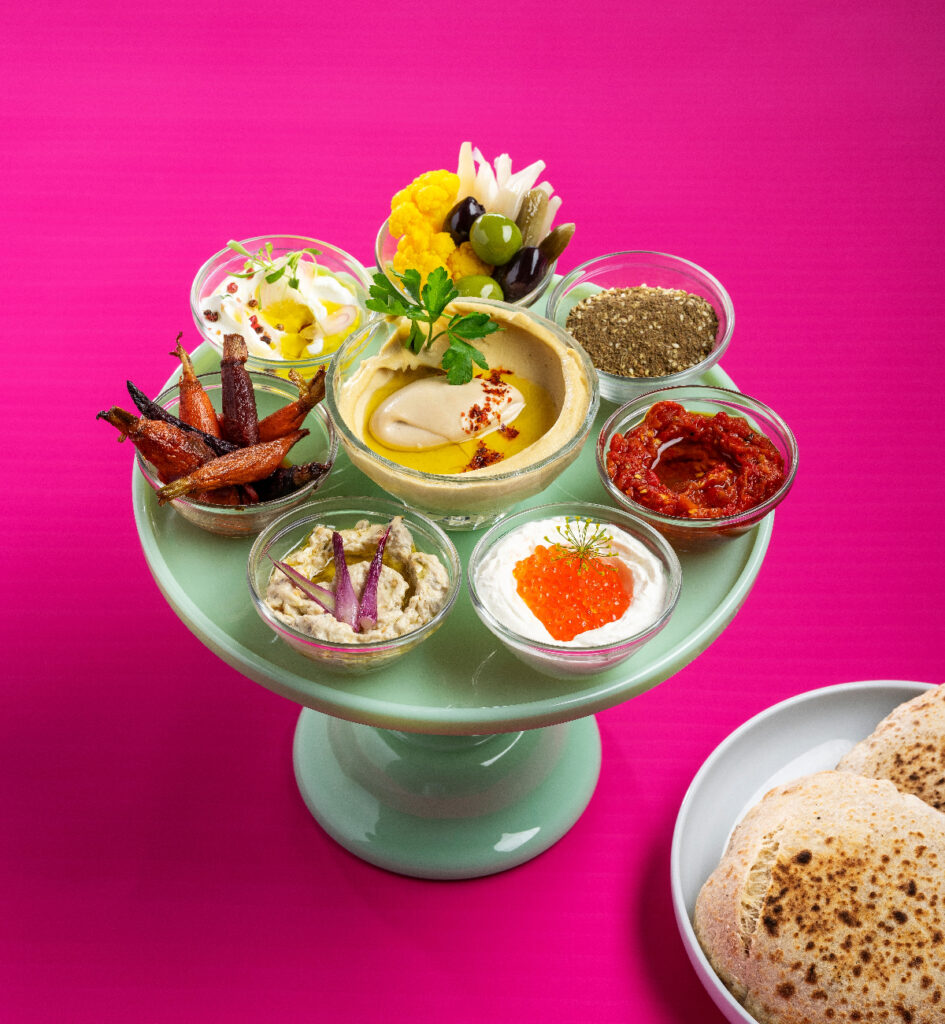 Like its muse, the residency evokes 1960s-era Las Vegas Vegas with a bold, retro color scheme, floral touches, and glitzy details. The menu channels her spirit with favorites from Safta’s Denver location alongside new offerings that are exclusive to Las Vegas. Highlights include a Salatim Platter featuring Chef Alon’s curated tasting of dips, spreads, vegetables, and fresh milled wheat pita; Lamb Ragu Hummus with crispy garbanzo beans; Ora King Salmon with red beets, tahini, coriander, and dill; and, Dover Sole Schnitzel with tzatziki and pickled shallots. Luxurious add-ons—Osetra caviar for Jumbo Lump Blue Crab Hummus and Beef Tartare; black truffle for Duck Matzah Ball Soup and Prime Bone-In Ribeye—create an exciting new experience for guests, while a signature Tableside Jelleaux Service featuring layers of cherry-berry, elderflower yogurt, and limeade gelatin presented with a colorful array of accoutrement; Chocolate Tahini Pie with sesame and toasted marshmallow; or an assortment of Safta’s Sweets.