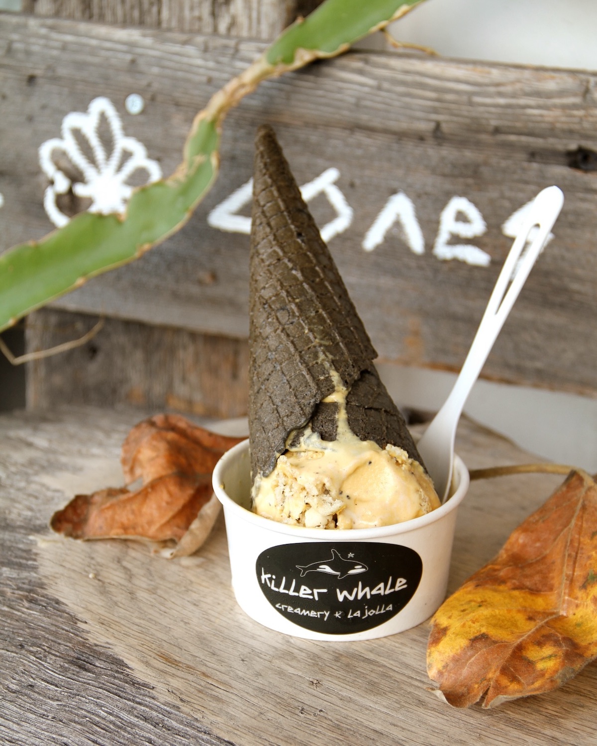 The Killer Whale Creamery menu features dairy-based flavors like Smores on the Beach, Horchata Churro Topped with Serrano Sugar, and Lovely Vanilla Chai Tea. Then there are Vegan flavors like Strawberry Coconut, Mexican Tajin Topped Chamoy, and Blueberry Dark Chocolate.