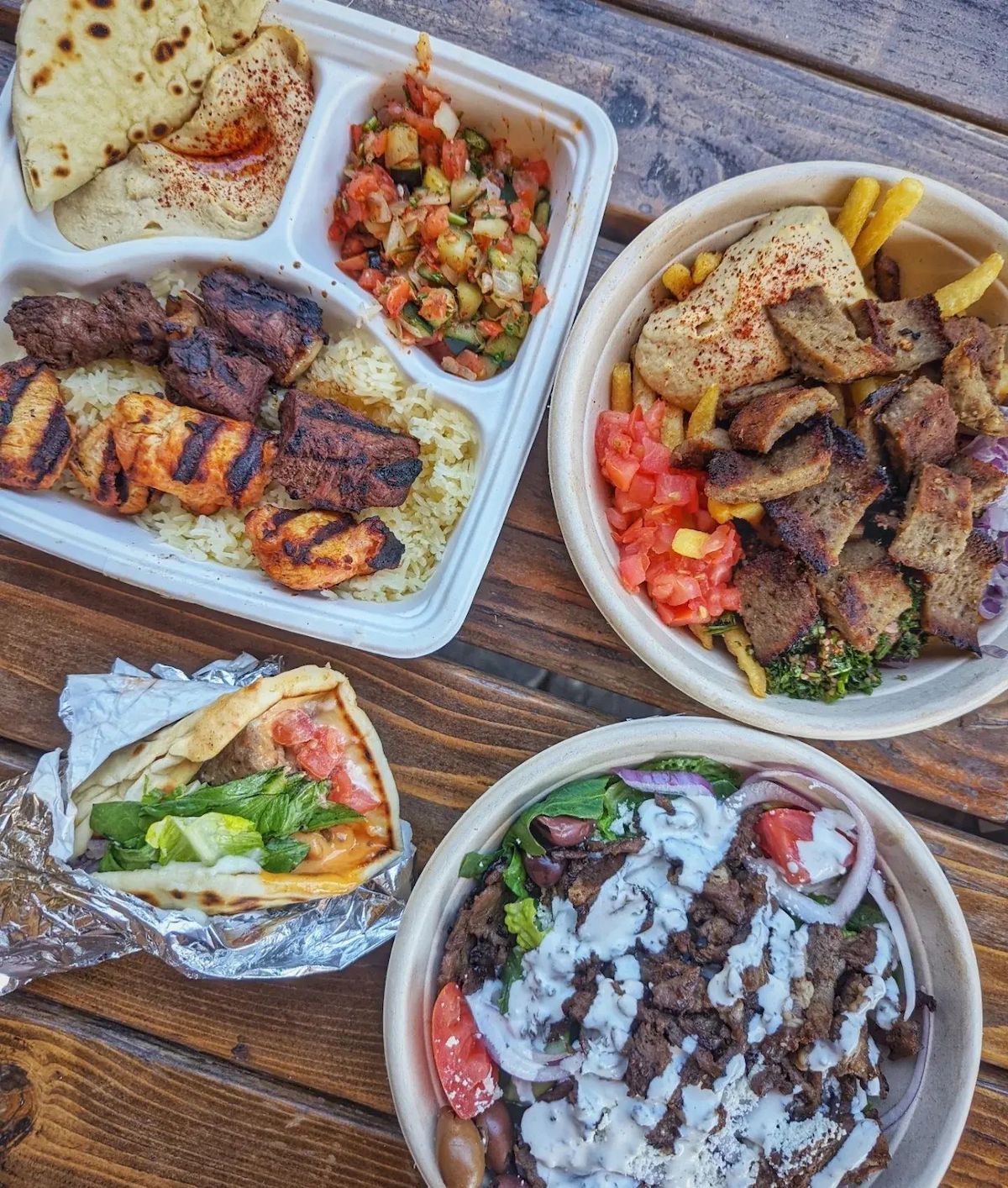 Inspired by Greek, Armenian, and Lebanese cuisines, the menu features appetizers and spreads like hummus, baba ganoush, and tabouleh. Main dishes include Chicken Kebab, a Beef & Lamb Gyro Plate, and a Beef Shawerma Plate. Rice Bowls include the Falafel bowl (with rice, Israeli Salad, tahini, and pita), in addition to salads like the Original Greek Salad or the Veggie Kebab Salad, and a selection of pita wraps, which feature similar choices in pita sandwich form.