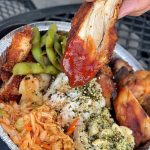 The menu also features sushi burritos, salads, and small entrées like bulgogi, chicken katsu, and teriyaki chicken. From the grill, Grilled Miso Mackerel and Salmon Collar are available. Appetizers include gyoza, Korean Fried Chicken, and Spicy Garlic Edamame.