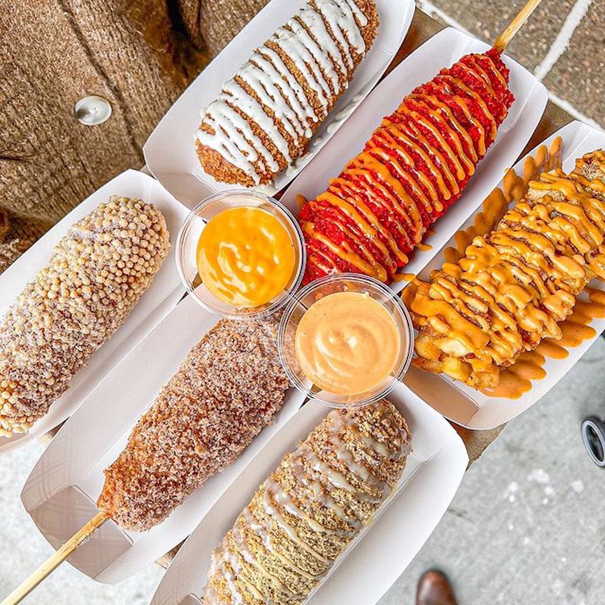 The corn dog is fully customizable and need not necessarily contain corn or dog, with sausages replaceable in part or in full with mozzarella and/or cheddar, or with spicy beef sausages or vegan sausages, and with the corn replaceable with other options like potato and crispy rice.
