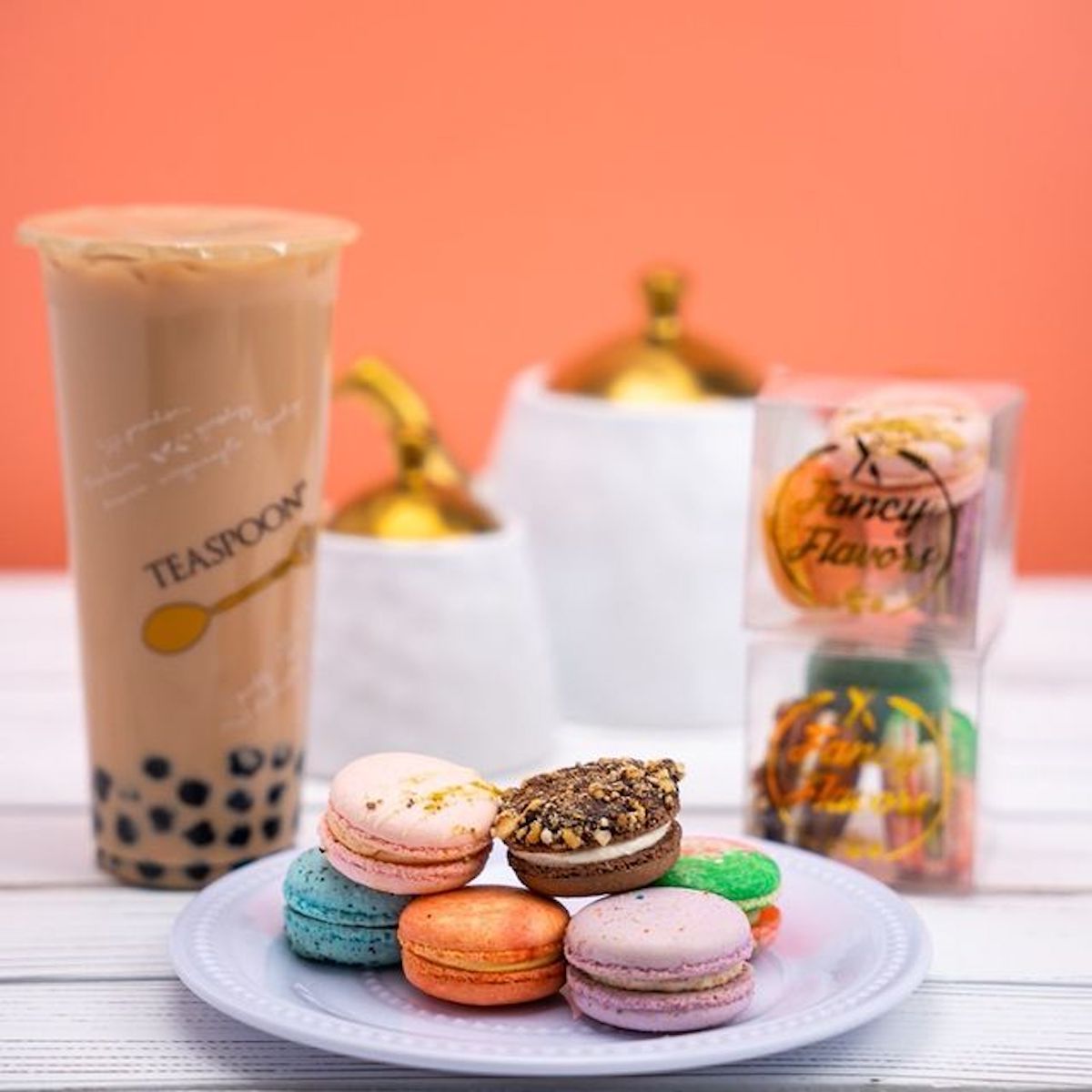 Teapoon serves a variety of signature drinks, like the Silky Mango and the Flamingo, in addition to proven boba tea-shop favorites like Taro Milk Tea. The menu also features macarons in adventurous varieties like Ferrero Rocher, Pistachio Guavo, and Pumpkin Spice Latte.