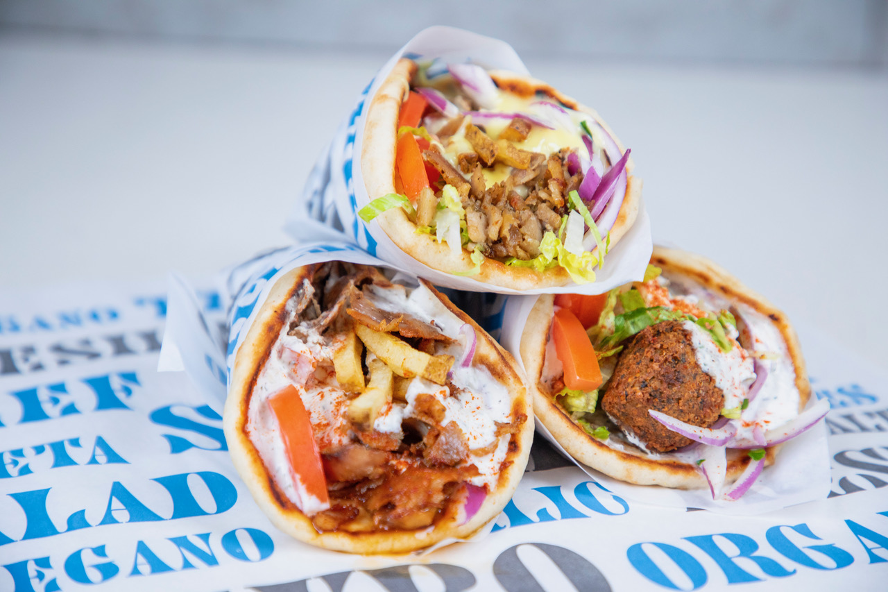 The menu at Nick the Greek includes chicken and pork souvlaki, a Grecian burger, gyros, and falafel.