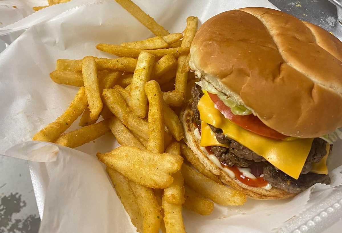 The menu features a variety of burger options, from single patties to stacked doubles and triples. Each burger comes loaded with lettuce, tomato, cheese, onions, pickles and mayo—plus the option to add bacon. One standout is “The Memphian,” a local favorite made with a burger patty, cheese, bacon, tangy barbecue sauce, crispy onions and a toasted bun.