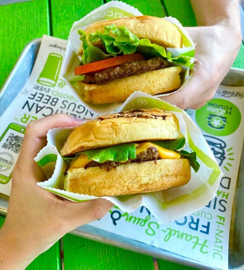 BurgerFi offers a menu of elevated fast food choices, with burgers ranging from the BurgerFi Cheeseburger to the Swag (Spicy Wagyu) Burger, with two wagyu+brisket blend patties, charred jalapeños, candied ghost pepper bacon, sweet tomato relish, Pepper Jack cheese, and hot steak sauce. A selection of plant-based burgers completes the picture.