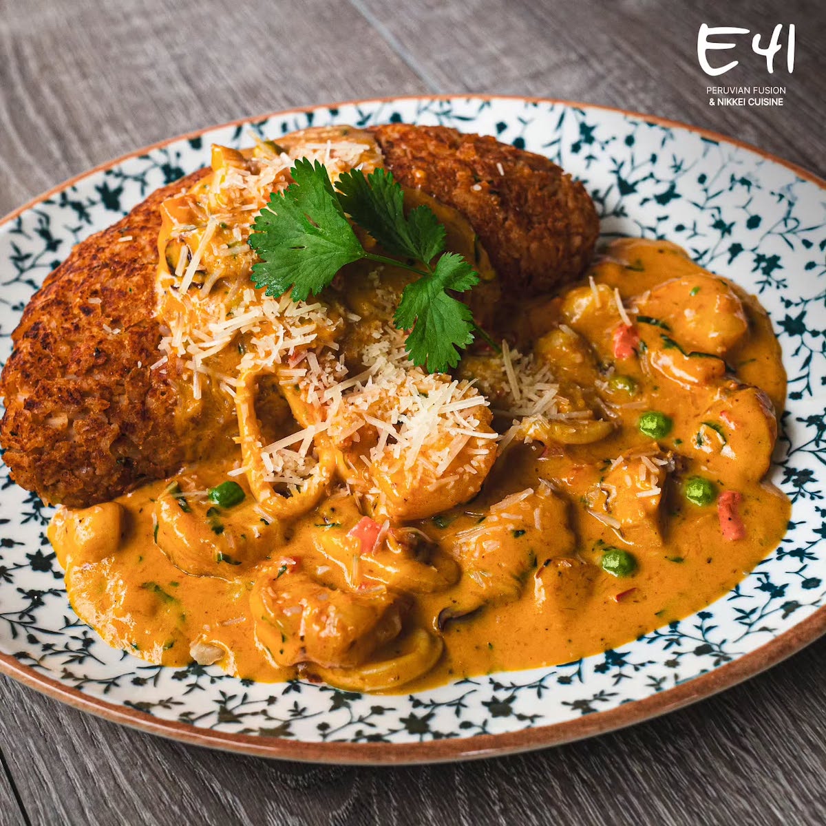 From there follow Tiraditos and Ceviches, Maki rolls, and E41 Classics like Pescado Con Camarones en Salsa Oriental (Corvina fillet and sautéed shrimps in our secret oyster sauce accompanied by oriental vegetables) and Tacu Tacu con Lomo Saltado (‘atamalado’ rice with canary beans and our traditional ‘Lomo Saltado,’ beef tenderloin cut into dices with tomatoes and onions flambé with pisco and soy sauce).