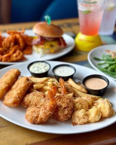 Flanigan’s menu opens with a selection of starters like the brand’s Award Winning Chicken Wings, Garlic Rolls, and Steamers. Ten Ounce Burgers and Waytoobig Sandwiches—served with choice of curly French fries, baked potato, or dirty rice—include the Texas Burger (Crispy bacon, crumbled bleu cheese, a stack of Tumbleweed Onions, all drizzled with our homemade wing sauce), the Blackened Tilapia Sandwich, and the Chipotle Salmon Sandwich.