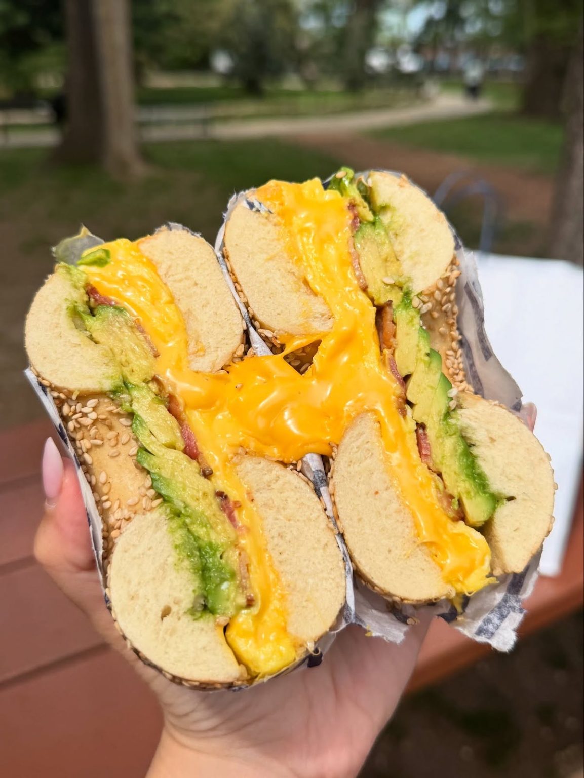 The menu features bagel sandwiches like the Nova Salmon with “The Works” (Savory thin-sliced smoked salmon and cream cheese, topped with tomato, onion, and capers), the Avocado Deluxe (Hand sliced avocado, tomato, cucumber, everything seeds, and mayo), and the Classic Bacon, Egg and Cheese.