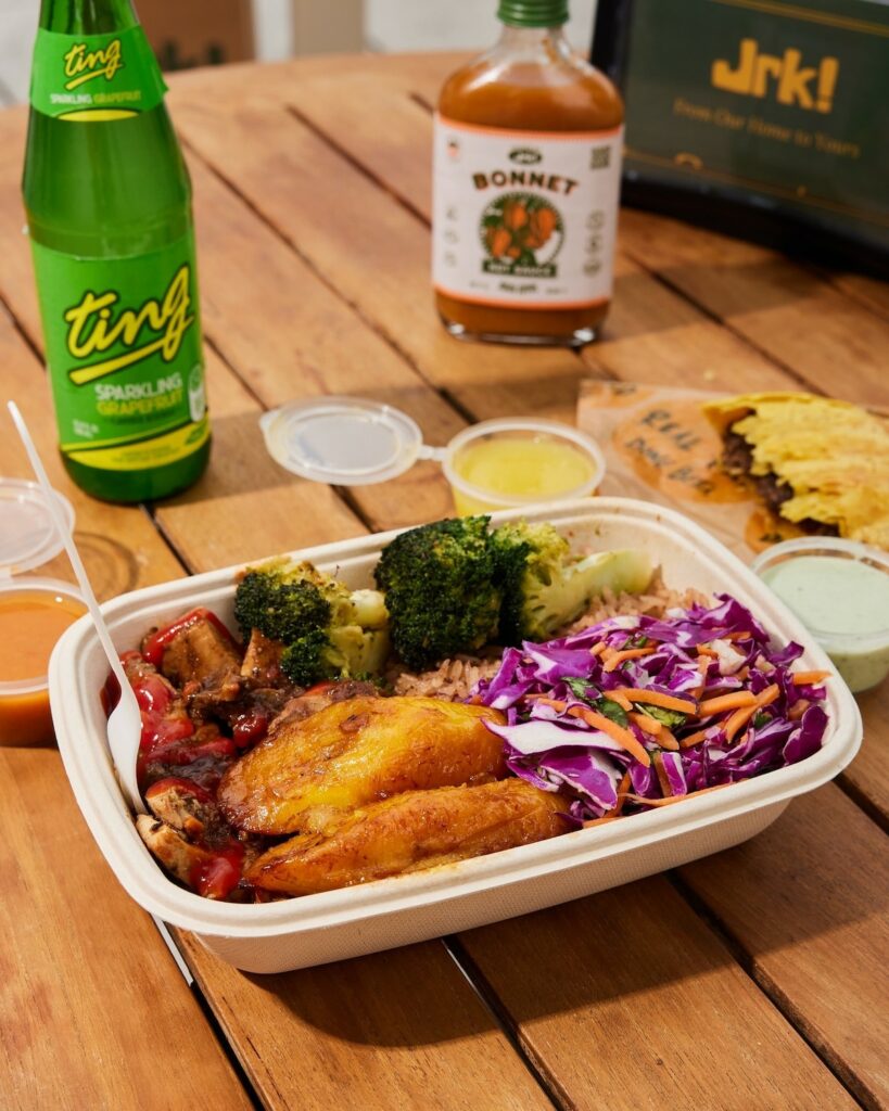 The menu takes a build-your-own-bowl approach to fast-casual Jamaican cuisine, allowing guests to match bases like Rice and Peas, Jerk Fried Rice, and Green Spring Mix with Proteins like Jerk Chicken, Pepper Steak, and Mango Shrimp, along with a selection of toppings and sauces.