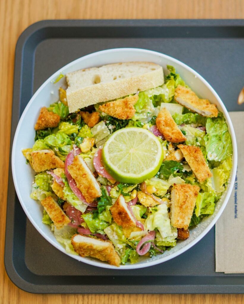 Just Salad’s salad menu features healthy choices like Crispy Chicken Poblano (Extra Crisp Romaine + Shredded Kale, Crispy Chicken, Grated Cotija, Hass Avocado, Roasted Corn, Overnight Pickled Onions, Crunchy Tortillas, Fresh Lime), the California Cobb, and the Chipotle Cowboy w/ Beyond Chicken® (Extra Crisp Romain, Beyond Chicken®, Homemade Pico de Gallo, Hass Avocado, Crunchy Tortillas).