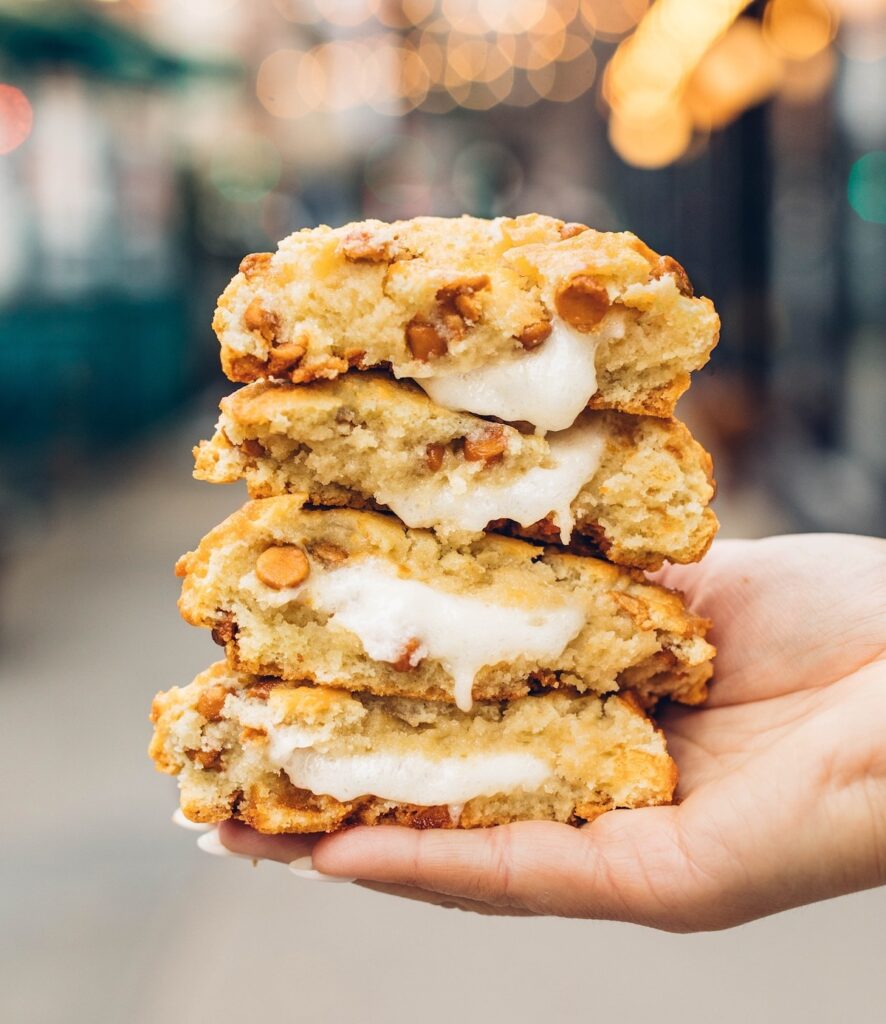 Each Chip City store offers six different cookies from an ever-growing pool of flavors, and although these flavors constantly revolve, there are a few constants: Chip City always offers a chocolate chip cookie and a plant-based, dairy-free cookie. Flavors have included Triple Chocolate and the Cannoli Cookie, along with seasonal varieties like Pumpkin Spice Latte and Super Specialties like Italian Rainbow and Baklava.