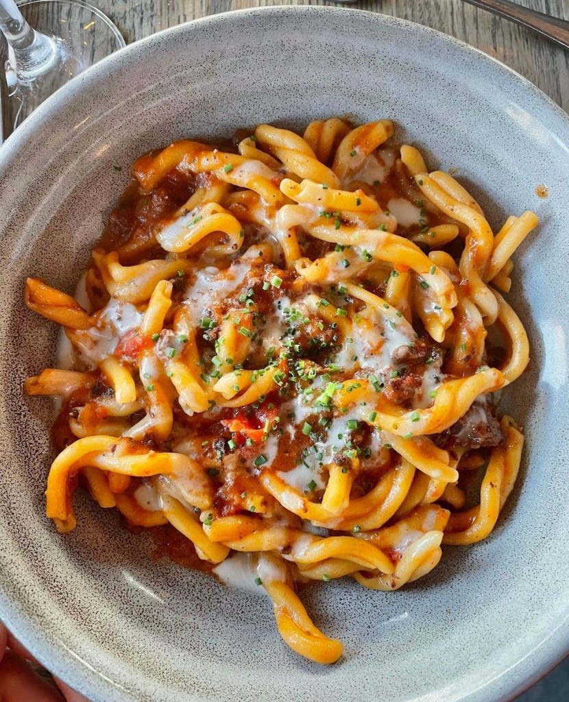 The dinner menu at Etta’s Bucktown location in Chicago opens with Starters like a Fire-Baked Focaccia with ricotta, honey, and truffle, or Rack Roasted Oysters with smoked tomato butter, lovage, and lemon. Pasta dishes include Bucatini Cacio e Pepe and Cappelletti en brood, with beef cheek, porcini, ricotta, and mushroom consommé. Wood-fired pizzas come in familiar varieties like Margherita and Pepperoni, along with more elaborate flavors like the Fire Pie (sausage, giardiniera, chile de arbol) and Coppa & Fig (burrata, guajillo, arugula).
