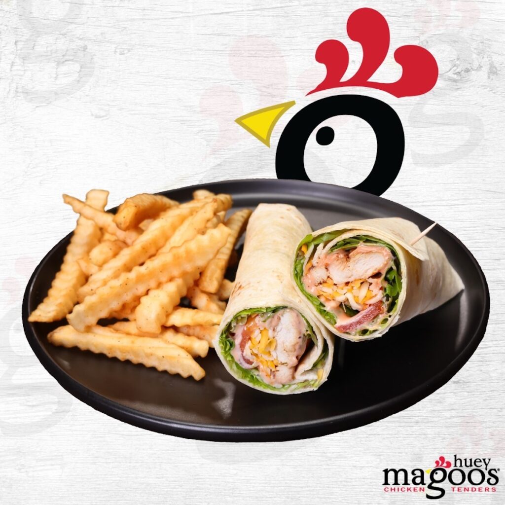 Huey Magoo’s offers its tenders in three-, five-, and seven-piece meals, served up with coleslaw, crinkle-cut fries, Texas toast, and Magoo’s Dip. There’s also the Magoo’s Sandwich, with tenders, thick-cut dill pickles, and a drizzle of Magoo’s sauce. (It’s available with hand-breaded or grilled chicken, and also as a wrap.)