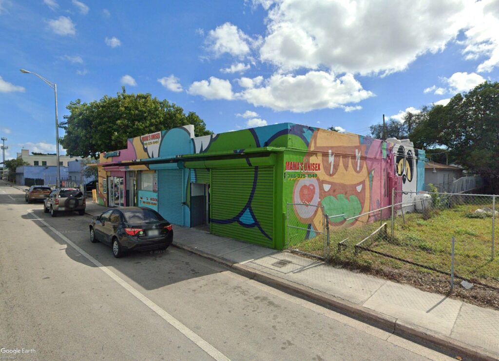 The building on Northwest 54th Street is situated near the southeast corner of the intersection with Northwest 11th Avenue, in a building currently occupied by 54th Street Market. Further east is True Vine Worship Center, and across 54th is Happy Buck Tobacco Shop.