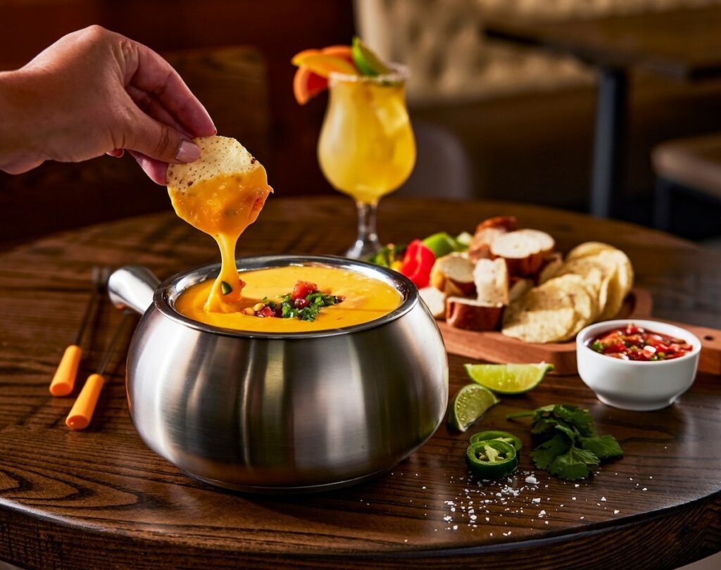 In addition to its a la carte menu, The Melting Pot offers four-course dinners for two, opening with a choice of cheese fondue. Served with artisan breads and seasonal fruits and veggies, cheese fondues include Wisconsin Cheddar (Aged Cheddar, Emmenthaler, Sam Adams Boston Lager, Garlic, Spices) and French Onion Gruyère (Gruyère, Raclette, Fontina, Beef Broth, Caramelized Onions).