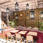 The venue provides a variety of dining experiences including an exquisite outdoor courtyard. The courtyard is a serene oasis where hand-painted murals are enveloped in moss. A striking Japanese pagoda frames the restaurant from the hotel’s courtyard, where guests are surrounded by palm trees and a water feature as the centerpiece.