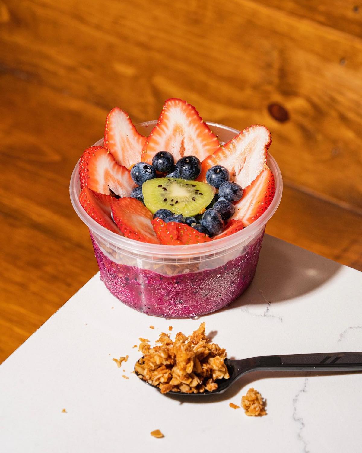 Açai, Dragon, and Chia Pudding Bowls feature your selection of a base, plus toppings like bananas, kiwi, peanut butter, sunflower seed butter, bee pollen, shaved coconut, and more.