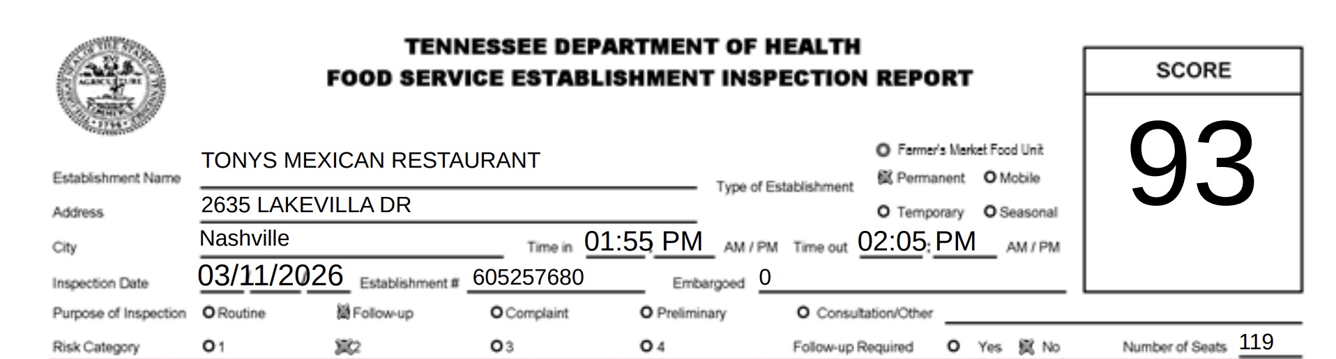Tony’s Mexican Restaurant received a routine inspection from the Tennessee health department on March 11. The inspection report listed multiple violations, and the restaurant received a score of 79. However, A follow-up inspection later the same day resulted in an improved score of 93.