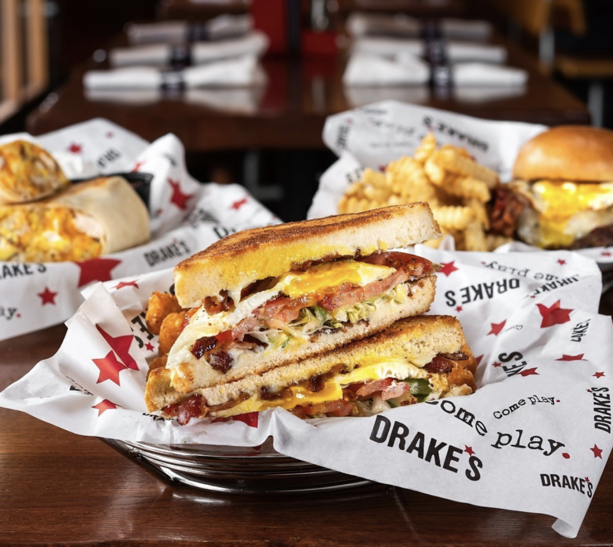 “Legend has it, Bruce Drake, co-founder of Drake’s, couldn’t sleep one night. So he grabbed his keys and went out in search of a good burger and good music in the kind of place he’d want to hang out in at any hour. To his surprise, that place didn’t exist. Most people would have given up and gone back to bed. But Bruce, being Bruce, hit speed dial and said, ‘Brian? Wake up buddy, I have this idea…’ And a concept called Drake’s was born,” states Drake’s website.