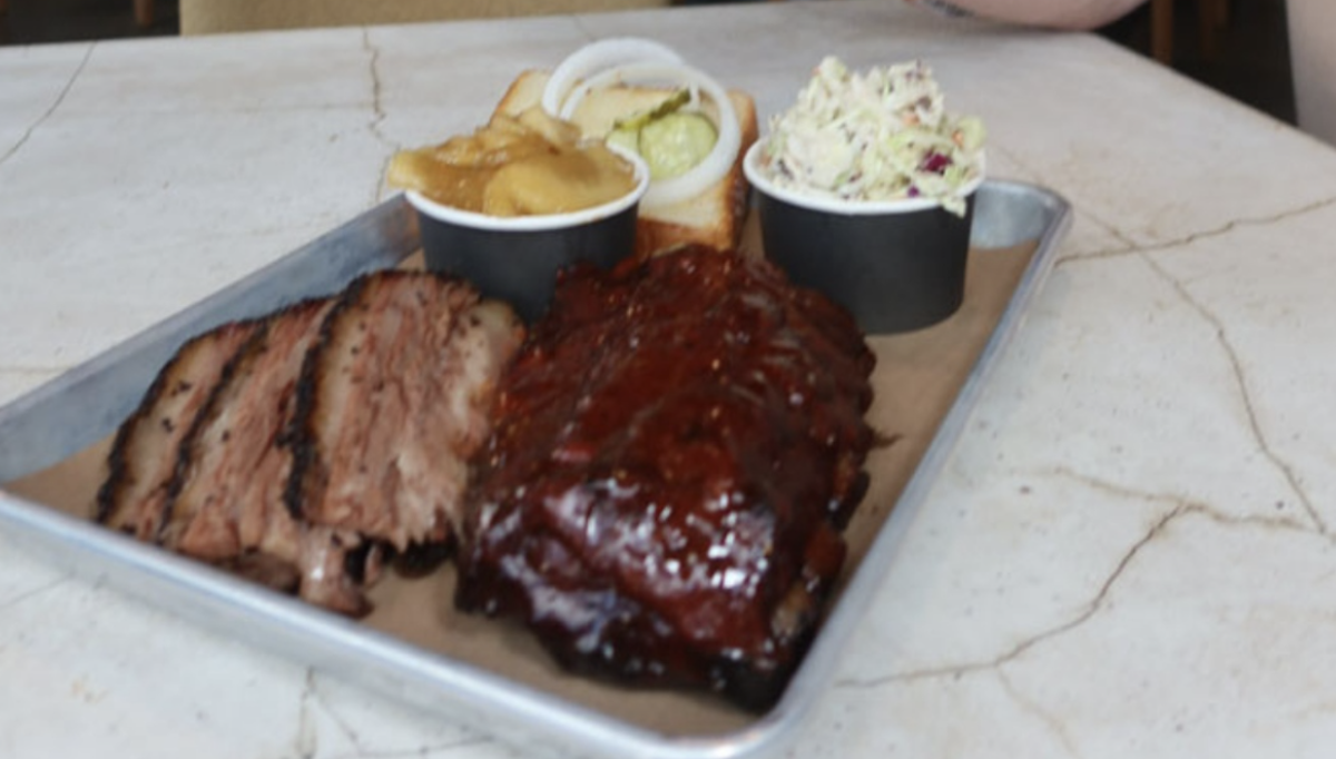 The menu features slow-smoked meats such as Texas brisket, Kansas City sweet sauce ribs and Memphis pork sandwiches. Their signature sandwiches include pulled pork, smoked chicken and chopped brisket. Other options include BBQ plates and sides such as creamy coleslaw, macaroni salad, sweet corn pudding and bourbon baked beans.