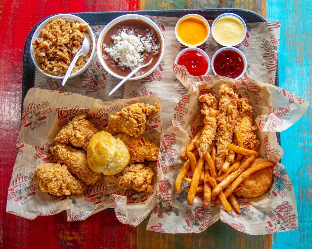 The restaurant serves classic breast, wig, thigh, and drumstick fried chicken. There are also chicken tenders or wings. Those looking for a bit of variety can get the Cajun catfish or one of the classic Southern sides, including jambalaya or red beans and rice. In addition to featuring fried chicken, Louisiana classics, daiquiris, and cold beer — every Willie’s Chicken Shack location features eclectic artwork from local artist Simon. The artwork is in keeping with the restaurant’s vibe as a fun place to start or end an evening in the French Quarter.
