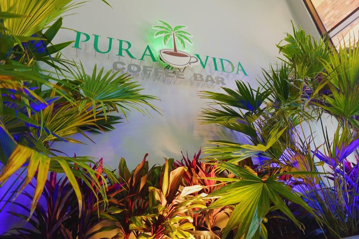 A former fitness center about one mile from Tiger Stadium has been completely transformed into the tropical-themed Pura Vida Coffee Bar, replete with 20-foot palm trees and Mid-Century Modern decor. The first floor features a long bar and a seating area behind that. The second floor area, which overlooks the bar, has lounge seating, a group study area for students, and plenty of chargers for electronic devices.