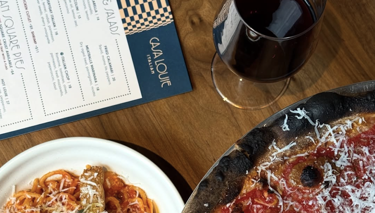 Casa Louie serves Italian cuisine, including Sicilian square pies; pizza such as vodka pie, spicy broccoli rabe (Calabrian chili, fresh mozzarella, scamorza and garlic) and prosciutto and arugula (San Danielle prosciutto, fresh mozzarella, pecorino, basil and lemon oil); sandwiches like Italiano and prosciutto and parm; and classic Italian favorites such as rigatoni carbonara, spaghetti limone and rigatoni vodka. The beverage program features cocktails and wine.
