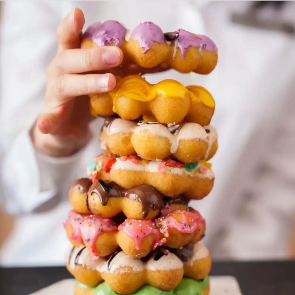 Mochinut’s Mochi donuts come in varieties like Strawberry, Coffee, Churro, Ube, Taro, Matcha, Peanut Butter, Cookies & Crème, and many more. There’s also a selection of hot dogs prepared fried in rice flour. Inside that crispy fried exterior one can find not only a hot dog but also gooey mozzarella (or half of each). The savory confections come in flavors like Rispy Rmane, Hot Cheetos, and Crunch Cereal.