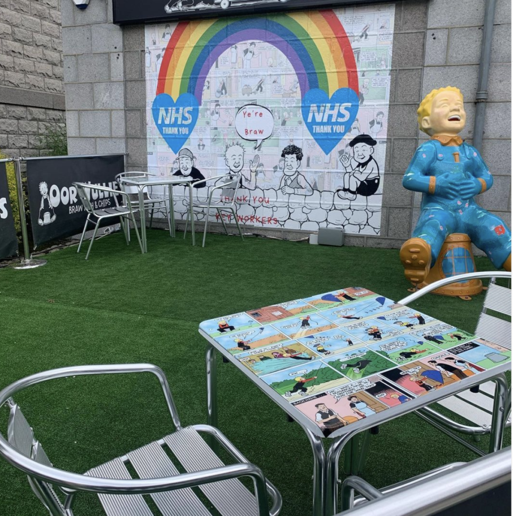 Named after the famous Scottish comic strip, Oor Wullie, that chronicles the character Wullie’s adventures, Oor Wullie’s Braw Fish and Chips features the famous character around their shops in the form of logos, statues and wall murals.