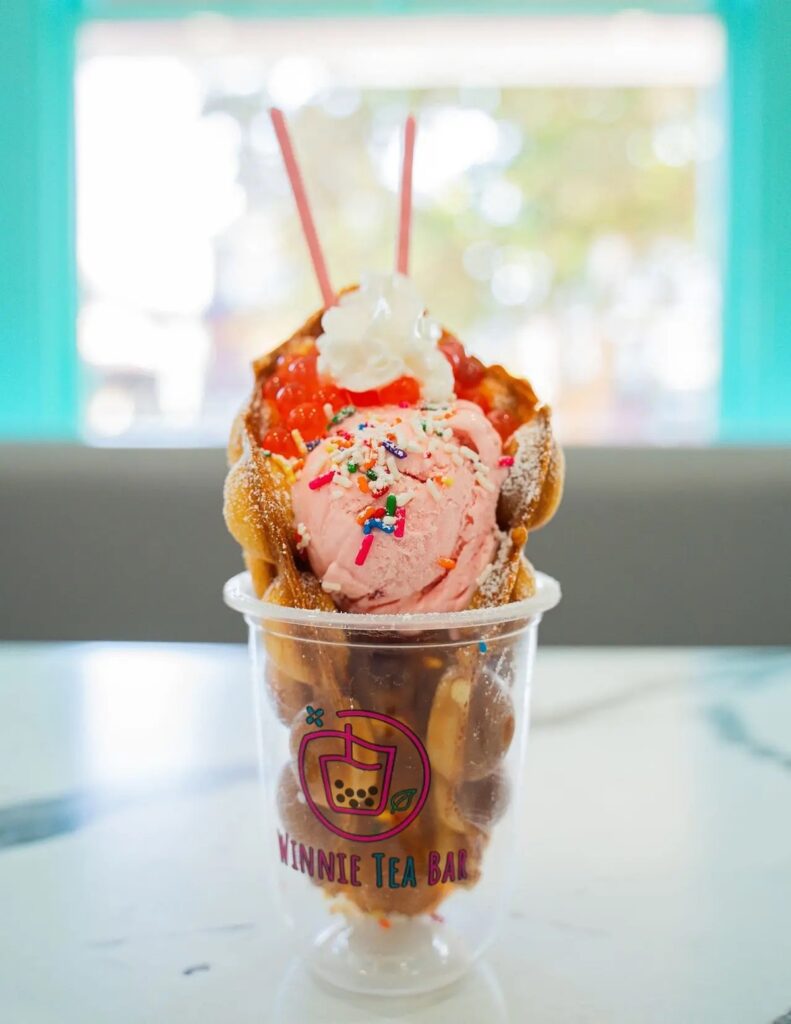 “Complementing its exquisite boba tea menu, The Winnie Tea Bar also serves up the sensational taste of bubble waffles. These golden delights are an ideal companion to the shop’s refreshing beverages, offering a mouth-watering bubble waffle wrapped around delicious ice cream and toppings. Available in a variety of flavors and toppings, the bubble waffles promise to satisfy sweet cravings with their unique texture and flavor profiles.”