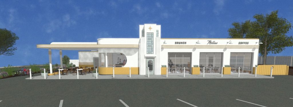Meanwhile, Millie’s aesthetic will draw on the building’s historic location and storied history, evoking the nostalgia and promise of “post-war gas stations that were once viewed as symbols of modernization and renewal.”