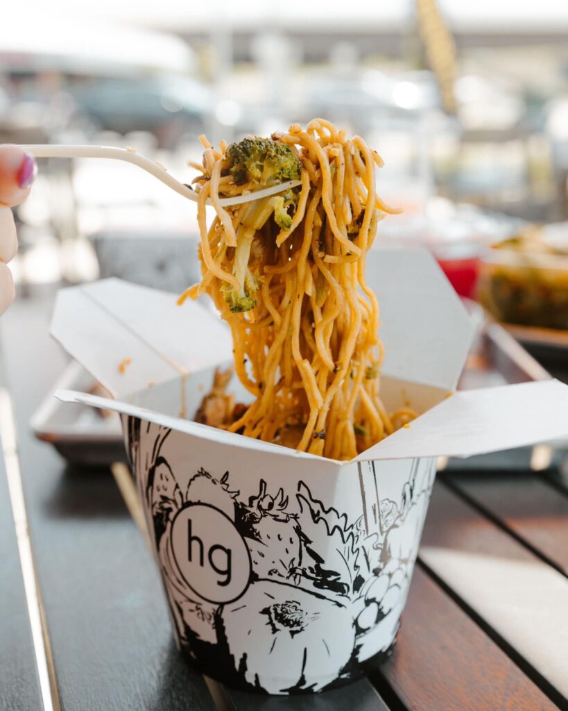 Honeygrow’s menu features five permanent stir-fry recipes, as well as one seasonal option, and six salads. Additionally, the establishment allows customers to create their own dishes, selecting a protein, mix-ins, and sauces.