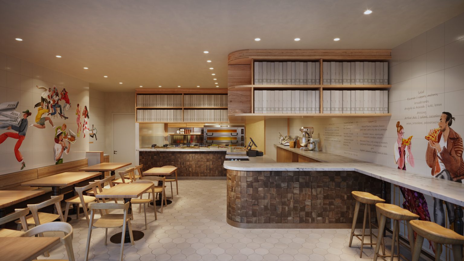 Scusi Pizza will offer a warm, modern setting with light wood tables and an open kitchen filling the space with the aroma of freshly baked pies. A colorful mural by New Jersey artist Victoria Tentler Krylor, celebrating pizza, community and featuring Chef Tourondel, brightens the left wall.