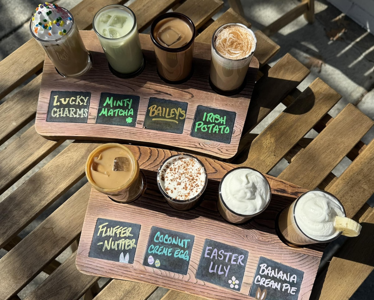 Guests can build four-drink coffee flights to pair with a baked good, choosing from iced espresso drinks, teas, matcha and chai. Flavors include blueberry, caramel, hazelnut, lavender, milk mocha, peanut butter, raspberry, simple syrup, toasted marshmallow, vanilla and white mocha. Seasonal flavors, milk alternatives and sugar-free syrups are also available, with whipped cream on lattes and cold foam on cold brews.