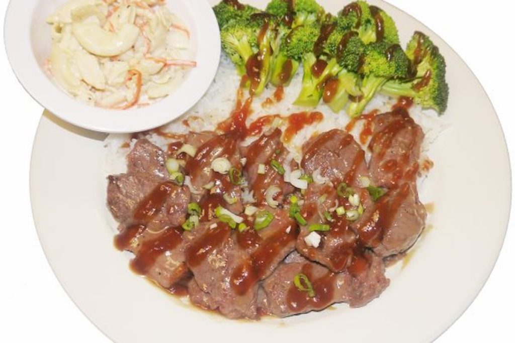 The Hawaiian side of the menu also serves Polynesian favorites like Kalua Pork slow cooked and served with green onion on a bed of white rice.
